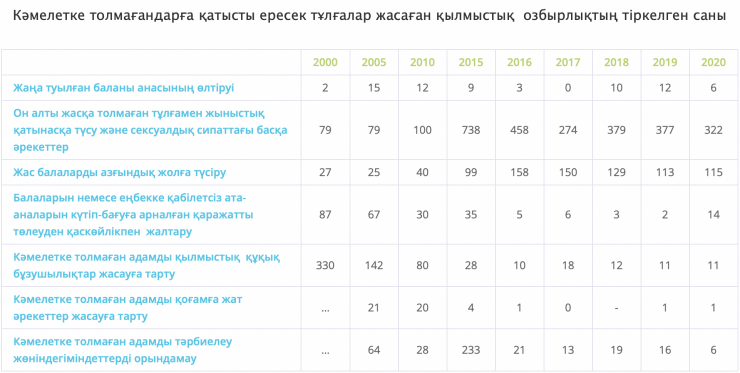 2020 жылы анасы жаңа туған баланы өлтірген 6 жағдай болған, ал балаларды азғындыққа итермелеудің 115 дерегі тіркелген.