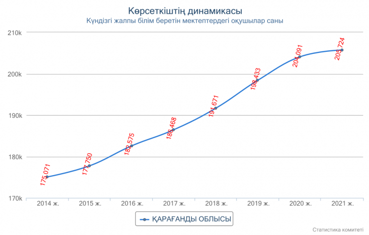 Былтырғы дерек бойынша, елімізде күндізгі жалпы білім беретін мектептердегі оқушы саны - 3 436 608. Ең көбі Түркістан облысында (499 111) және Алматы облысында (442 302).