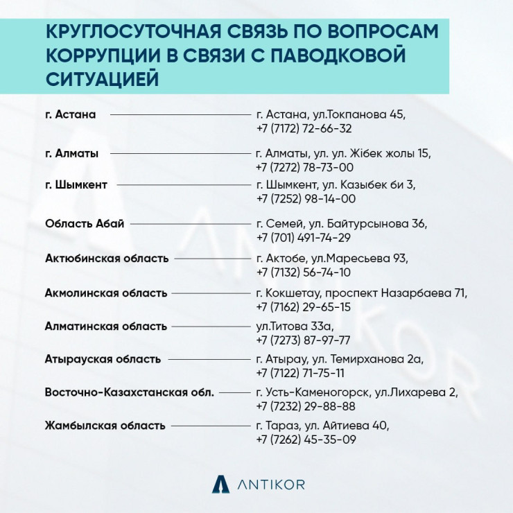 По всем возможным фактам мошенничества, злоупотребления и вымогательства, связанным с возмещением гражданам ущерба, нанесенного в результате паводков, а также по другим фактам коррупции казахстанцев просят обращаться на круглосуточные каналы обратной связи единого Call-центра по бесплатному номеру 1424, в чат-бот @antikorkz_bot, а также территориальные подразделения Антикоррупционной службы по следующим контактным номерам: