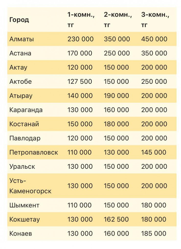 Самая дорогая аренда жилья в Алматы: 6 тысяч тенге за квадратный метр в среднем. Самая дешевая в Актау - 2 632 тенге за квадратный метр в среднем.