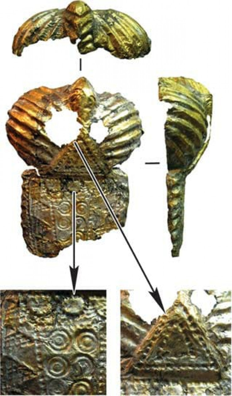 Там же найдены золотая обкладка деревянной поясной пряжки и "пряслице" из стенки лепного сосуда. На дне погребальной камеры обнаружены остатки потревоженного человеческого скелета. В анатомическом порядке сохранились кости ног, кисти правой руки, предплечья и кисти левой руки.
