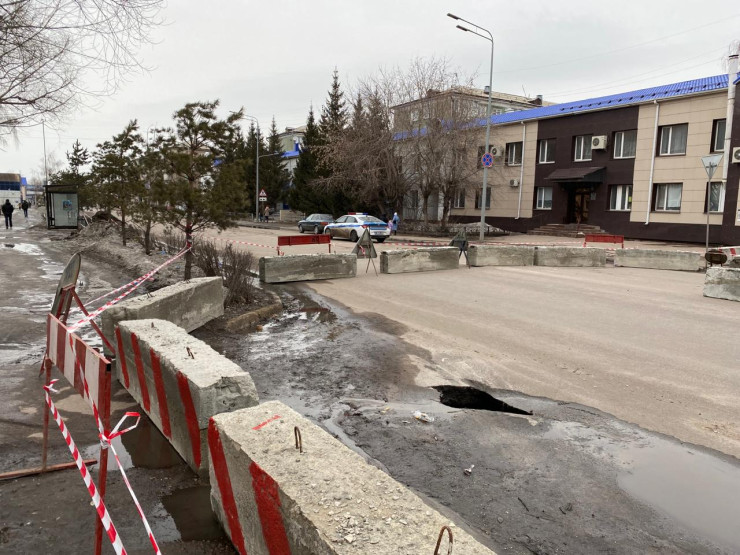 Провал на оживленной проезжей части по улице Абая огородили, движение для транспорта перекрыли. На месте дежурят патрульные полицейские.