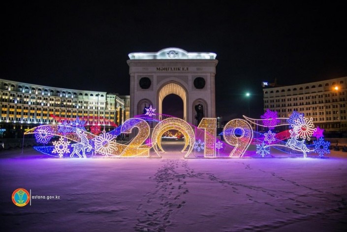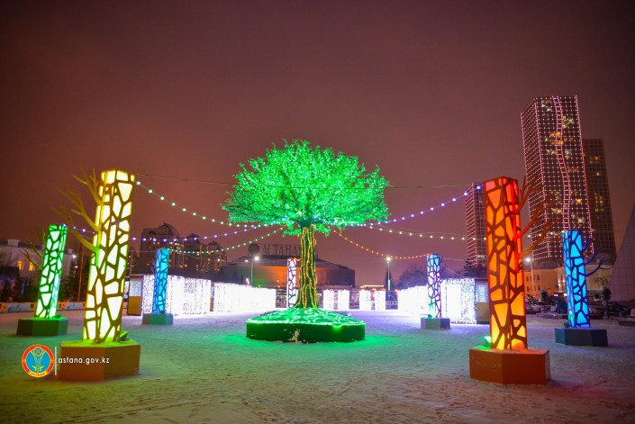 Городская площадь, Ботанический сад, территория EXPO-2017, парк "Жетысу", территория у торгово-развлекательного центра "Хан Шатыр", Президентский парк, площадь у монумента "Қазақ Елі", парк "Ататюрк", набережная реки Есиль, парк "Жеруйық", набережная реки Акбулак и территория у спортивного комплекса "Алатау" преобразились благодаря объемным декорациям, елкам, оригинальным пряничным домикам.