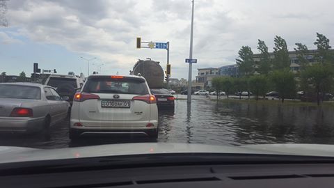 В Астане затопило некоторые улицы после дождя. Очевидцы присылают в редакцию фото и видео с затопленных участков. Данное видео было снято в 9.35 утра на пересечении улиц Нажимеденова - Калдаякова.