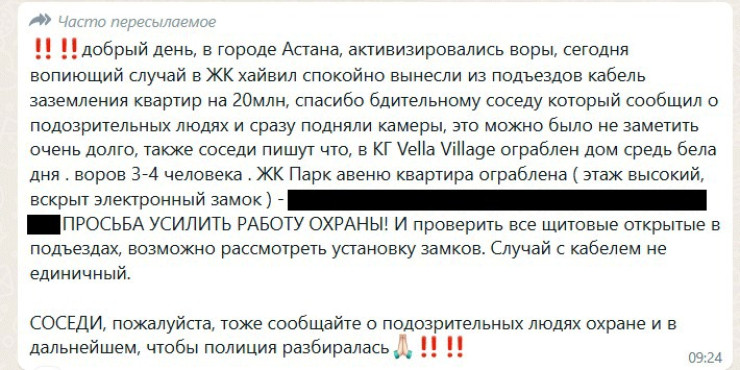 Жители столицы пересылают в домовые чаты тревожное сообщение о нескольких кражах в жилых комплексах и коттеджном городке Астаны. Они также призывают соседей быть бдительными и просят усилить охрану домов, передает корреспондент Tengrinews.kz.