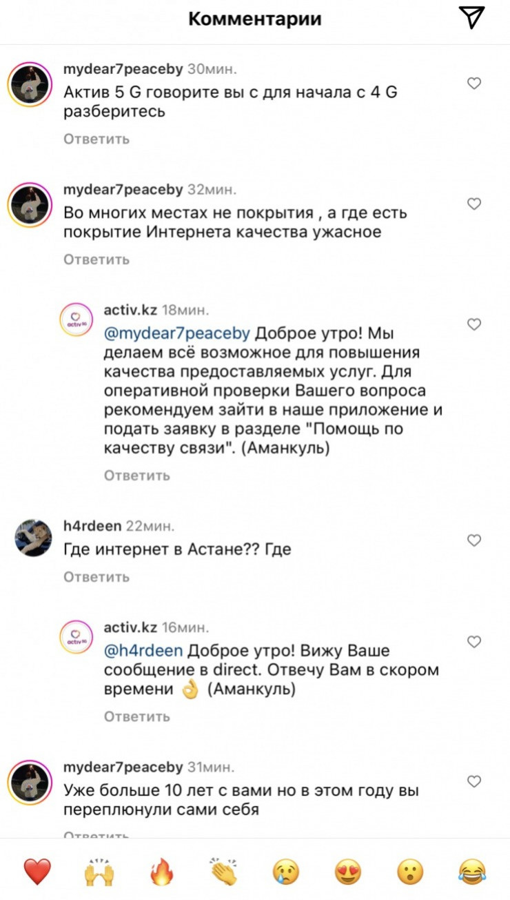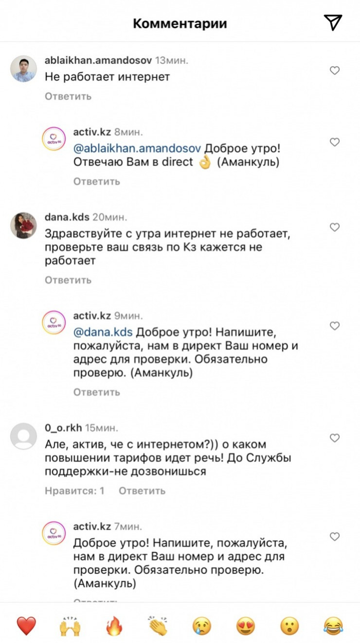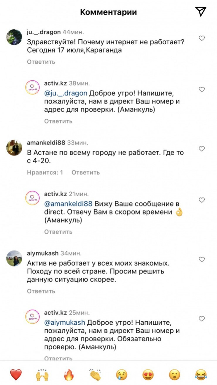 Жители столицы пишут в комментариях под публикациями на официальной странице сотовой компании Activ в Instagram сообщения об отсутствии связи и доступа к сети. Некоторые заявляют, что аналогичные проблемы наблюдаются и в Караганде. Другие предполагают, что подобный сбой имеет массовый характер по всей стране. Однако в других городах пока не появлялись сообщения о таких проблемах.