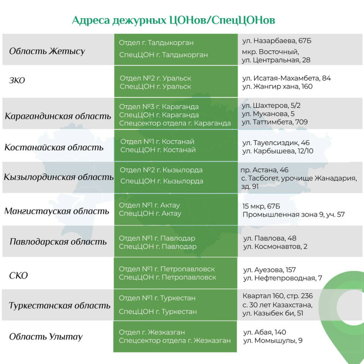 Как говорится в сообщении, со 2 сентября меняются адреса дежурных ЦОНов и спецЦОНов в Астане, Алматы, Шымкенте и Семее. Их актуальные адреса представлены ниже.