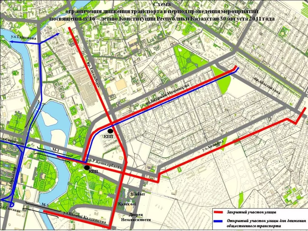 "30 августа 2011 года с 8 утра до окончания мероприятий, примерно до 13 часов, будет полностью закрыто движение на следующих участках улиц: по проспекту Момышұлы - от проспекта Абылайхана до улицы Сарайшық; по улице Айнакөл - от проспекта Абылайхана до проспекта Тәуелсіздік; по улице Кошкарбаева - от моста М-1 до проспекта Тәуелсіздік с отводом движения на улицу Орынбор; по улице Калдаякова - от моста М-3 до проспекта Тәуелсіздік с отводом движения на улицу Орынбор и по проспекту Тәуелсіздік - от улицы Ташенова до улицы Калдаякова", - перечислил дорожный полицейский улицы, которые будут перекрыты.