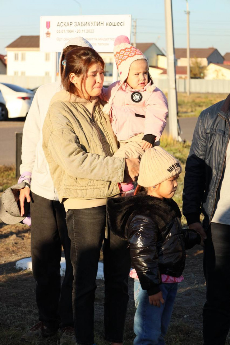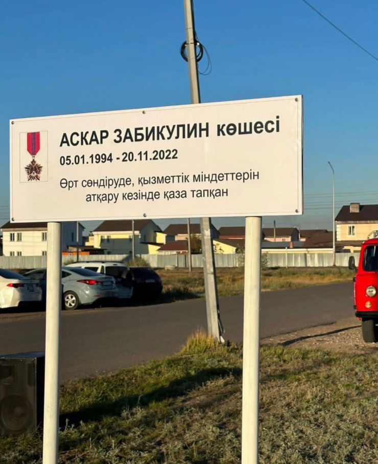 "Одной из улиц Астаны в целях увековечения памяти отважного пожарного присвоено имя Аскара Забикулина, установлена памятная табличка. В открытии улицы приняли участие родственники, супруга и дети Аскара Забикулина, ветераны органов гражданской защиты, руководство и личный состав ДЧС Астаны. В ходе мероприятия близкие Аскара Забикулина, сотрудники и ветераны ДЧС посадили деревья", - сообщили в ведомстве.