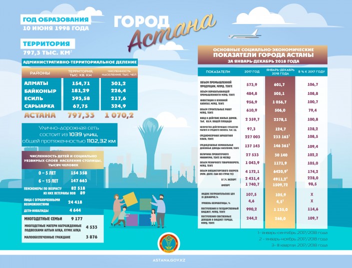 Социально-экономические показатели 2018 года свидетельствуют о росте благосостояния жителей Астаны, сообщили в городском управлении стратегического и бюджетного планирования. В столице Казахстана зафиксирован самый низкий показатель в республике по безработице (4,5 процента), поэтапно увеличивается зарплата четырех тысяч медработников (на 20 процентов), среднемесячная номинальная заработная плата выросла на 5,6 процента, среднедушевые номинальные денежные доходы – на 9,4 процента. Вместе с тем по поручению Главы государства для горожан снижены коммунальные тарифы, в том числе на электроэнергию – на 13 процентов, водоснабжение и водоотведение – на десять процентов, теплоснабжение – на девять процентов, вывоз твердых бытовых отходов, лифтовые услуги и услуги КСК – на пять процентов.