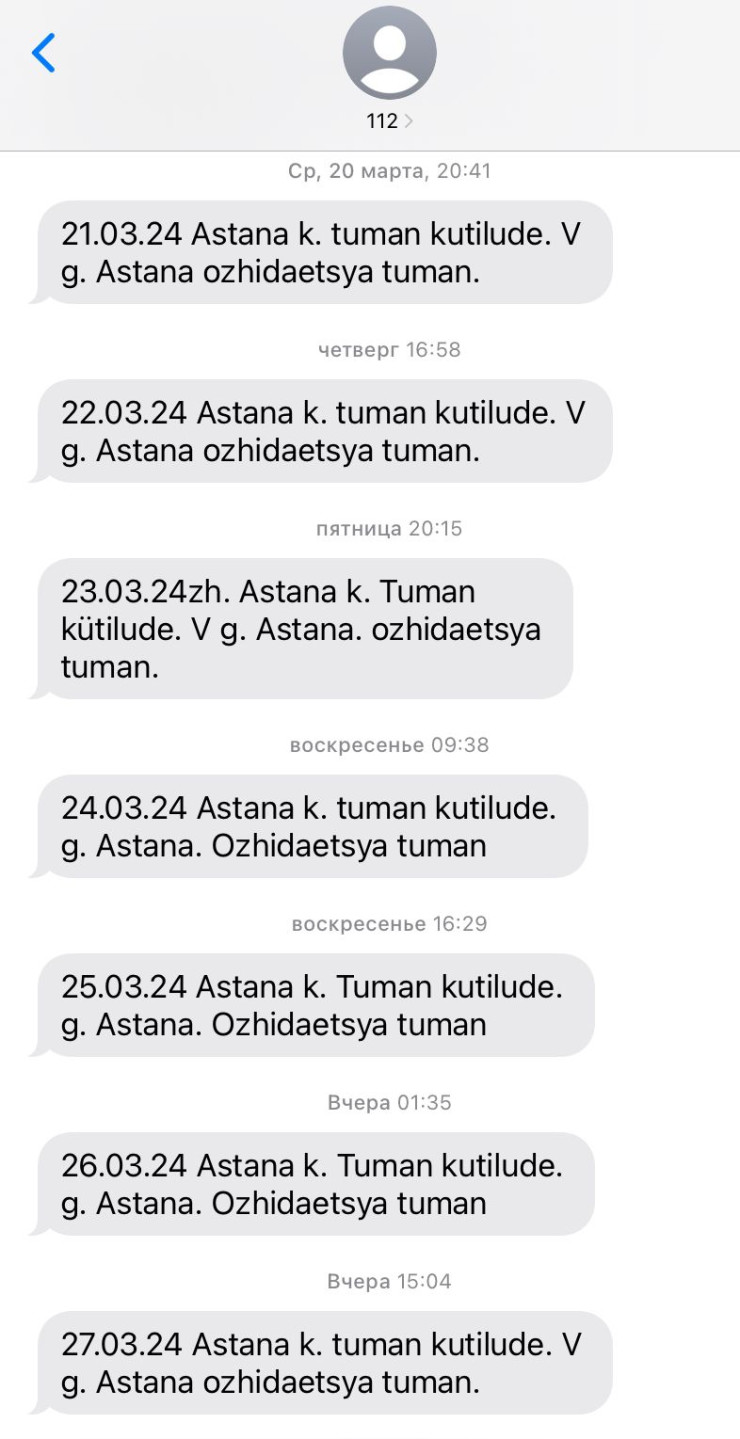Неделю астанчане получали SMS-сообщения от службы 112 с предупреждением о тумане. Действительно, в эти дни город окутал густой туман, сократив видимость на дорогах.