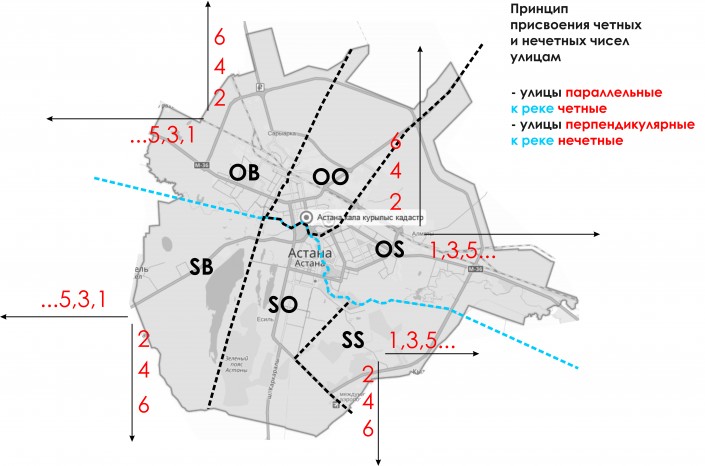 Принцип присвоения индексов улицам заключается в разделении города на шесть ориентировочных районов - это правый берег - запад, центр, восток, и, соответственно, левый берег - запад, центр, восток. Границы разделения соответствуют естественным границам, таким как реки Есиль, Сарыбулак, Акбулак, озеро Талдыколь и канал Нура-Ишим.