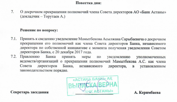 На заседании совета директоров банка 20 декабря рассмотрели уведомление Мамытбекова о досрочном прекращении его полномочий как члена совета директоров банка, независимого директора по собственной инициативе.