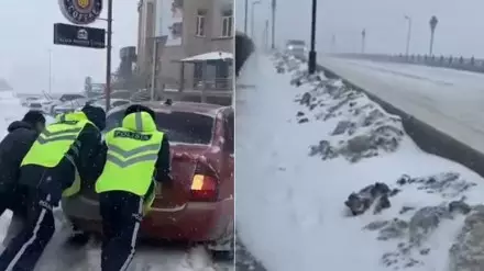 Из-за нехватки техники на занесенных снегом улицах люди помогают друг другу откапывать и выталкивать машины.