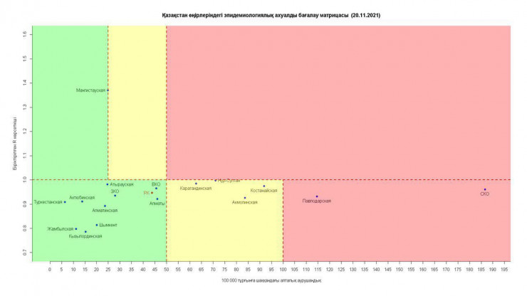 В "зеленой" зоне: города Алматы, Шымкент, Атырауская, Актюбинская, Алматинская, Западно-Казахстанская, Туркестанская, Жамбылская, Кызылординская, Мангистауская, Восточно-Казахстанская области.