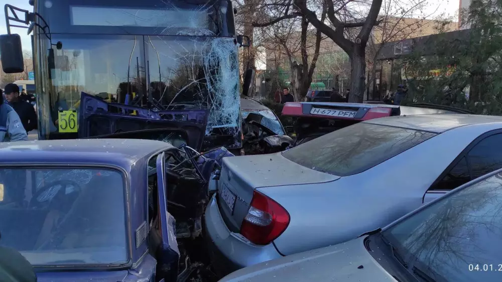 "33-летний водитель маршрутного автобуса № 56, следовавший по проспекту Толе би в городе Тараз, не справившись с рулевым управлением, выехал на полосу встречного движения и совершил столкновение с припаркованными автомобилями (10 единиц)", - сообщили в ДП области.