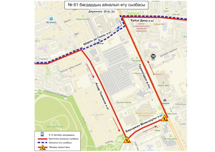 Сообщается также, что с 22:00 часов 9 июня до 22:00 часов 10 июня участок дороги на пересечении проспекта Кабанбай Батыра и улицы Хусейн бен Талал в рамках среднего ремонта проспекта Кабанбай Батыра будет полностью перекрыт.