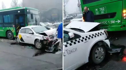 В Сети появилось видео аварии с участием такси и двух автобусов в Алматы. В результате ДТП пострадал 31-летний пассажир легковой машины. Подробности аварии рассказали в Департаменте полиции Алматы, передает корреспондент Tengrinews.kz.