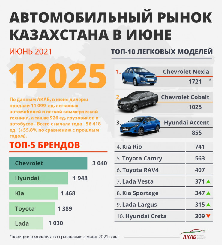 По данным Ассоциации казахстанского автобизнеса (АКАБ), продажи новых автомобилей в июне 2021 года увеличились на 21,18 процента по сравнению с июнем прошлого года. Казахстанские дилеры продали 11 099 легковых автомобилей и легкой коммерческой техники, а также 926 единиц грузовиков и автобусов.