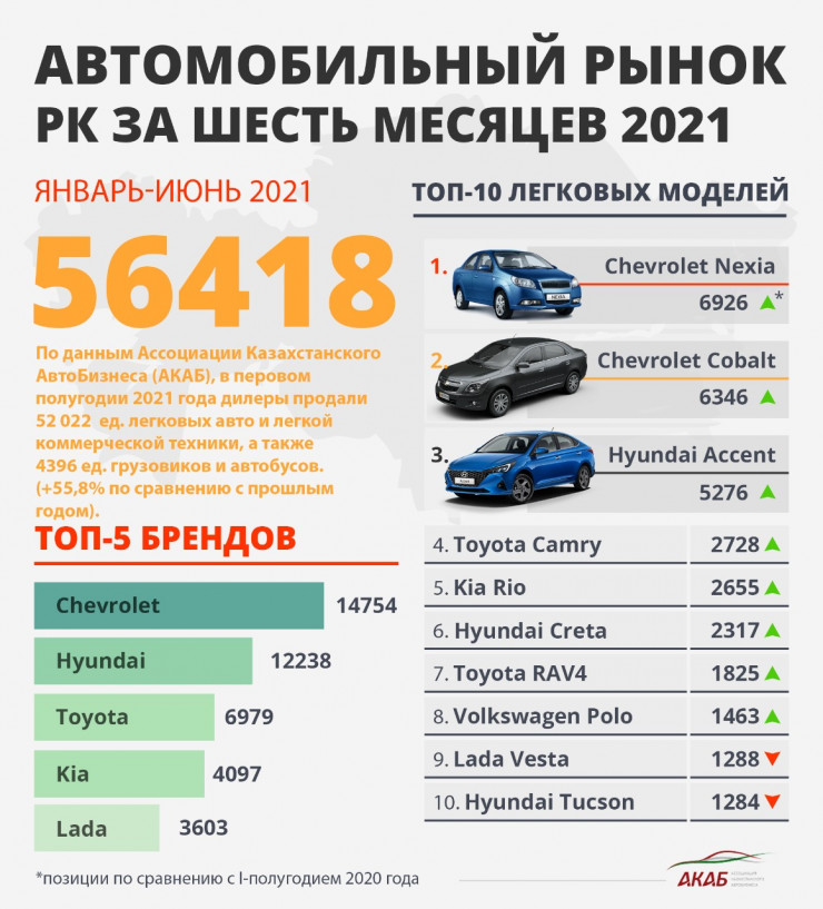 По итогам первого полугодия 2021 года казахстанский рынок вырос на 55,8 процента до 56 418 проданных автомобилей (36 208 единиц за январь-июнь прошлого года). Десятку брендов в первом полугодии возглавляет Chevrolet – 14 754 единицы, на второй строчке с результатом 12 238 автомобилей - Hyundai, третья позиция за Toyota - 6 979 автомобилей.