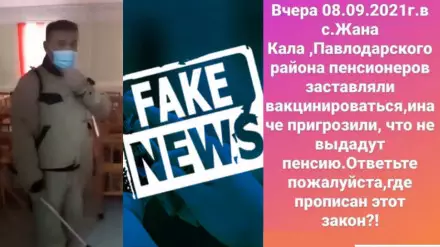"8 қыркүйекте Павлодар облысы Жаңа қала аулының зейнеткерлерін вакцина салдыруға мәжбүрлеген. Әйтпесе, зейнетақыны бермейміз деп қорқытқан. Бұл заң қайда жазылған?", - делінген Желіде тараған хабарламада.