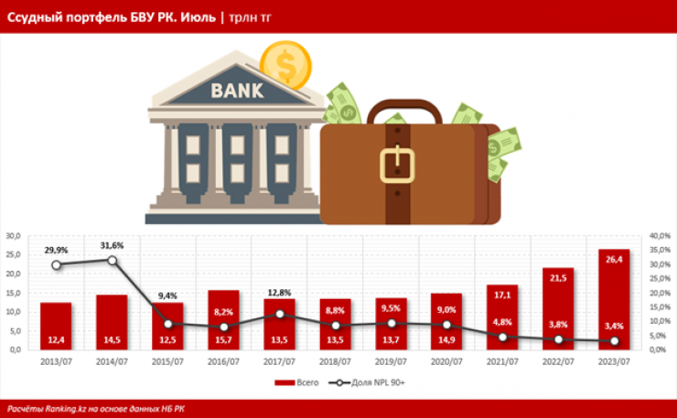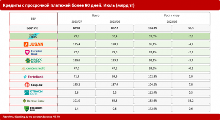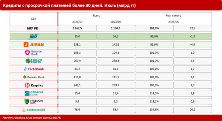 Качество кредитного портфеля – один из важнейших показателей деятельности БВУ. К августу текущего года ссудный портфель казахстанских банков составил 26,4 триллиона тенге — на 1,9 процента больше, чем месяцем ранее. В свою очередь, задолженность с просрочкой платежей свыше 30 дней достигла 1,2 триллиона тенге, на 2,9 процента больше, чем месяц назад. Сократить негативный показатель в месячной динамике удалось лишь некоторым банкам-кредиторам из топовой десятки. Лидером среди крупнейших банков по сокращению "короткой" просрочки стал Bank RBK: минус 3,4 процента за месяц, сообщает Ranking.kz.