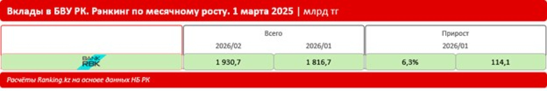 По данным аналитиков агентства, лидирует среди крупнейших банков страны по месячному росту вкладов с заметным перевесом Bank RBK: плюс 6,3 процента (или 114,1 миллиарда тенге), до 1,9 триллиона тенге. В Ranking.kz отмечают, что фининститут пользуется доверием как населения, так и бизнеса и предлагает популярные продукты обеим клиентским категориям.