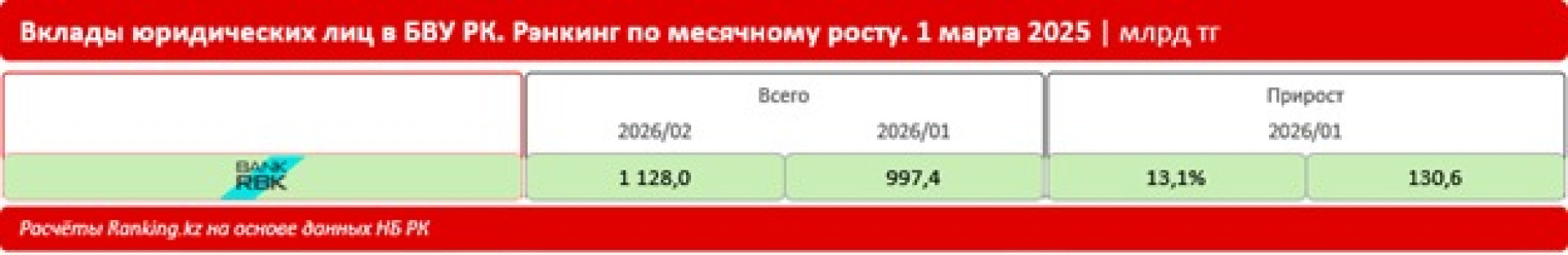 По данным рейтингового агентства, Bank RBK также лидирует среди топовых БВУ и по росту вкладов юрлиц: сразу плюс 13,1 процента (или 130,6 миллиарда тенге) за месяц, до 1,1 триллиона тенге. Аналитики Ranking.kz отмечают, что подобный рост — показатель доверия бизнеса к банку. В период, когда основную долю вкладов в БВУ РК формирует население, такой отличный показатель по бизнес-сегменту важен. Bank RBK в целом ориентирован в своей работе на всестороннюю поддержку бизнеса — в частности, МСБ.