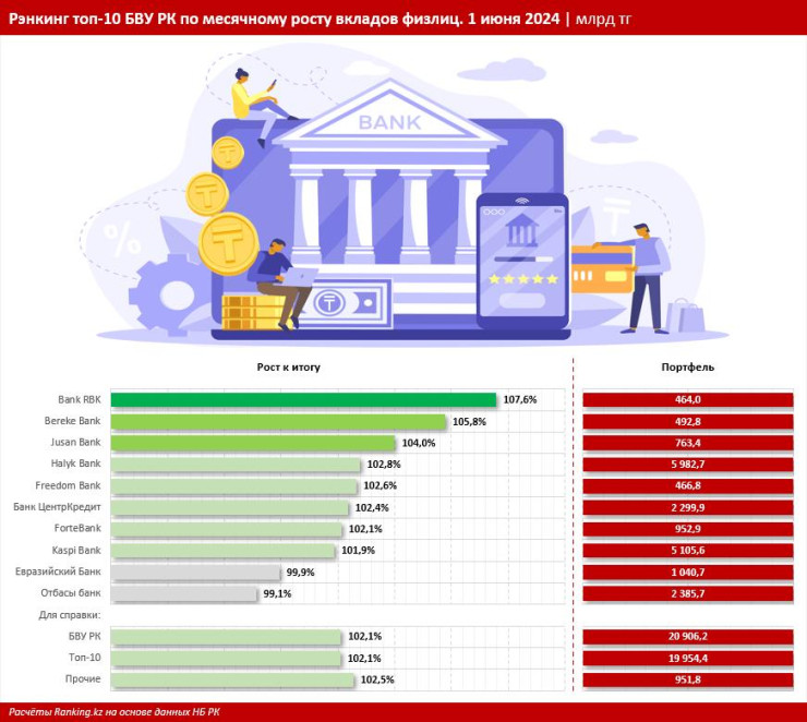 Второе место по месячному росту занял Bereke Bank: плюс 5,8 процента, до 492,8 миллиарда тенге. Замыкает тройку лидеров Jusan Bank с ростом на 4 процента, до 763,4 миллиарда тенге.