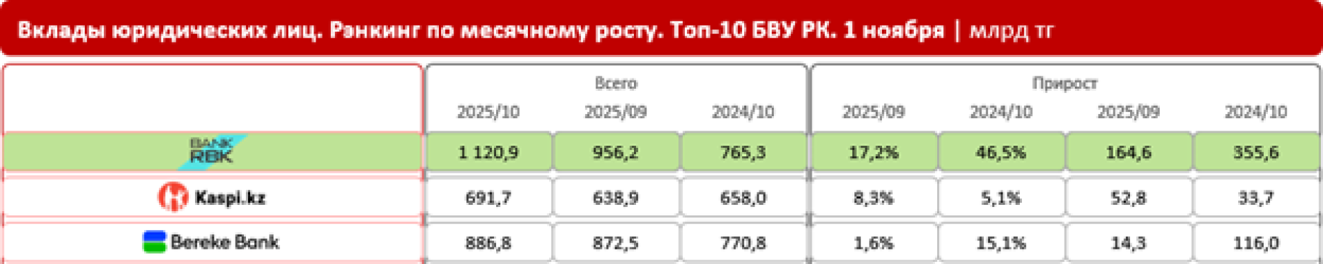Абсолютным лидером по месячному росту в топовой десятке банков — держателей вкладов бизнеса стал Bank RBK: сразу плюс 17,2 процента, до 1,1 триллиона тенге. Эта позитивная динамика для Bank RBK, по мнению аналитиков платформы, стабильное явление: фининститут лидирует по росту вкладов бизнеса и в годовой динамике, прибавив в сравнении с 1 ноября 2024-го сразу 46,5 процента. Это также заметно больше, чем в среднем по сектору, а также чем в среднем по крупным БВУ РК.