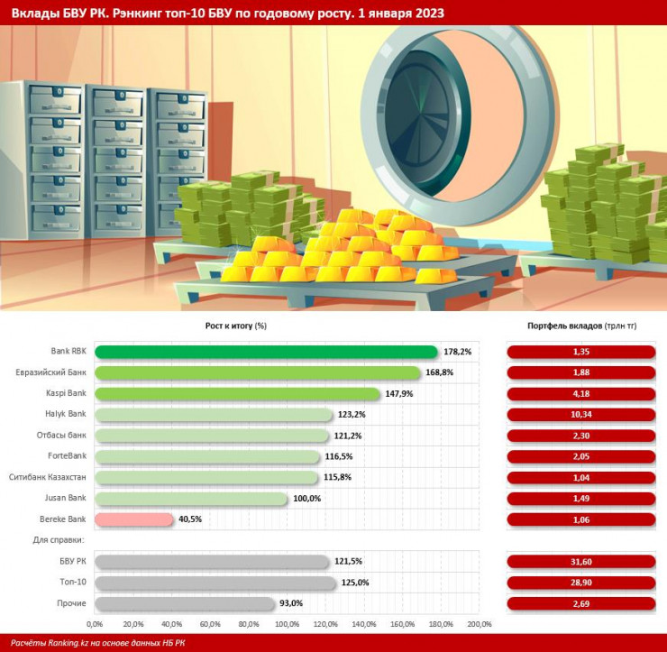 Объем депозитов в казахстанском банковском секторе в 2022 году вырос на 21,5 процента. Абсолютным лидером по росту вкладов клиентов среди топ-10 финансовых институтов страны стал Bank RBK, у которого этот показатель вырос на 78,2 процента, сообщает Ranking.kz.