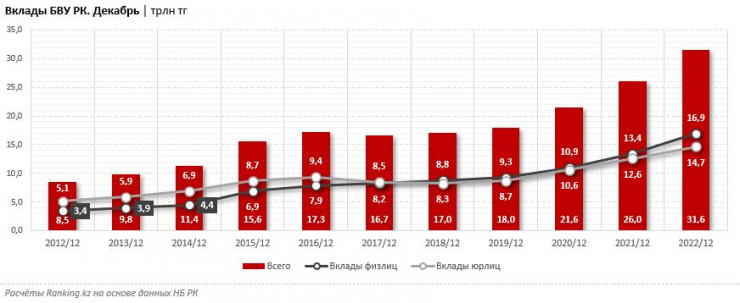 Рассмотрим годовое изменение вкладов БВУ РК. За год, к 1 января 2023-го, портфель вкладов в казахстанских банках вырос на весомые 21,5 процента, до 31,6 триллиона тенге. В разрезе клиентских сегментов вклады юрлиц выросли на 16,7 процента, до 14,7 триллиона тенге, вклады физлиц - на 26 процентов, до 16,9 триллиона тенге.