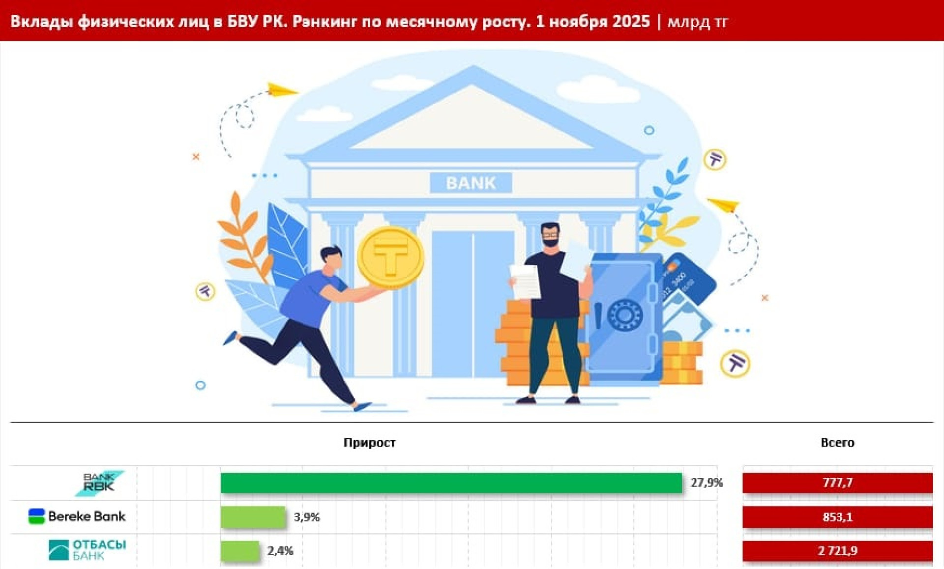 Bank RBK стал лидером среди казахстанских банков по месячному приросту депозитов физических лиц. Такие данные приводит аналитический ресурс Ranking.kz со ссылкой на статистику Национального банка РК.