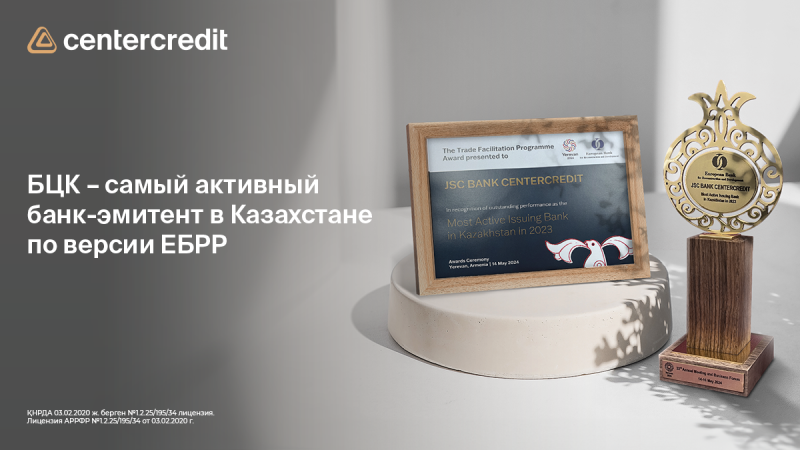 14 мая 2024 года в городе Ереване (Армения) состоялась церемония награждения в рамках информационной сессии Программы содействия развитию торговли ЕБРР (Trade Facilitation Program (TFP)). Мероприятие прошло в ходе 33-го Ежегодного собрания и бизнес-форума ЕБРР, где Банку ЦентрКредит была вручена очередная награда как самому активному банку-эмитенту в Казахстане. Победители в номинации определяются ЕБРР на основе количества проведенных сделок в рамках программы TFP.
