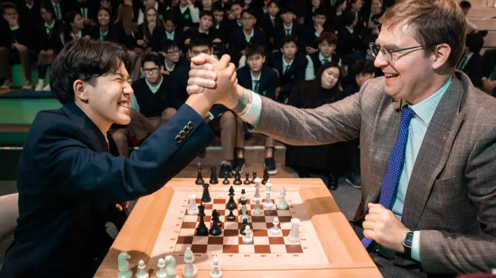 Особенным моментом встречи стал шахматный "баттл" между Тимуром Турловым и учеником Асылом Бектурганом из села Отеген Батыр Алматинской области. Этим летом Асыл завоевал третье место на международной математической олимпиаде Copernicus в Нью-Йорке.