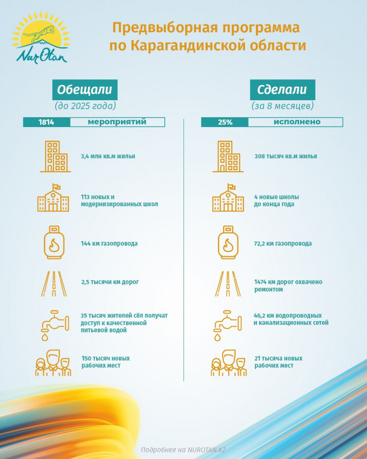 По его словам, в рамках озвученной Главой государства Касым-Жомартом Токаевым предвыборной программы "Путь перемен: Достойную жизнь каждому!" в области уже исполнено 25 процентов из 1 814 запланированных на 5 лет мероприятий. С начала года построено 308 тысяч квадратных метров жилья, 72 километра газопровода, 46 километров водопроводных и канализационных сетей, ремонтом охвачено 1,4 тысячи километров дорог. Завершается строительство 4 новых школ. В целях развития предпринимательства оказана финансовая поддержка более тысячи проектам на сумму 60,4 миллиарда тенге. Создано свыше 20 тысяч рабочих мест.