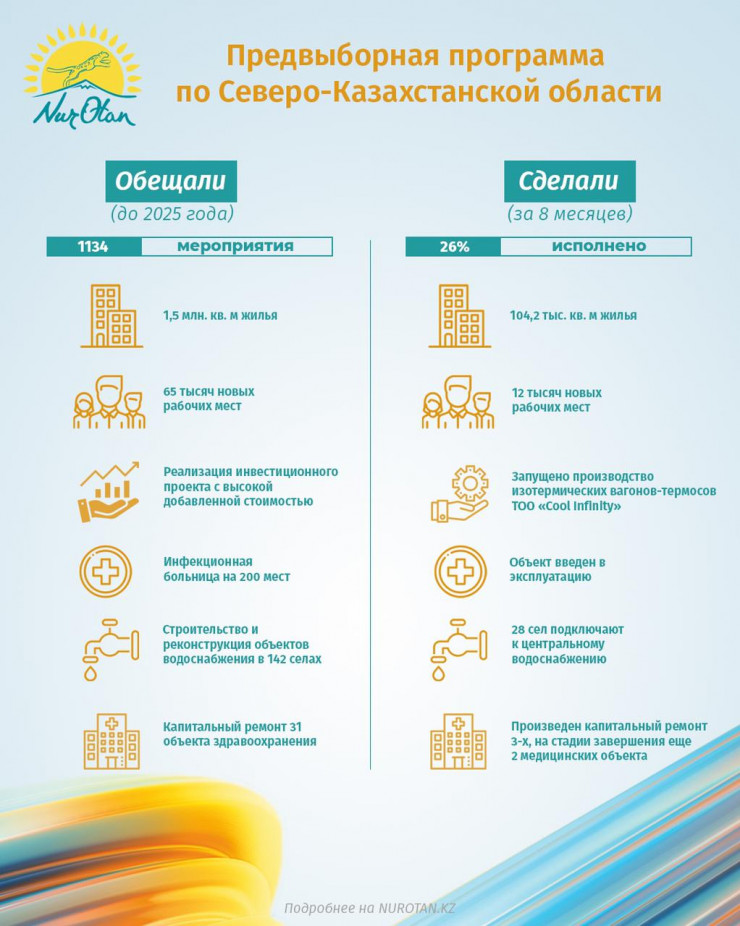 По словам заместителя партии, в Северо-Казахстанской области из запланированных 1 134 мероприятий исполнено уже 26 процентов.