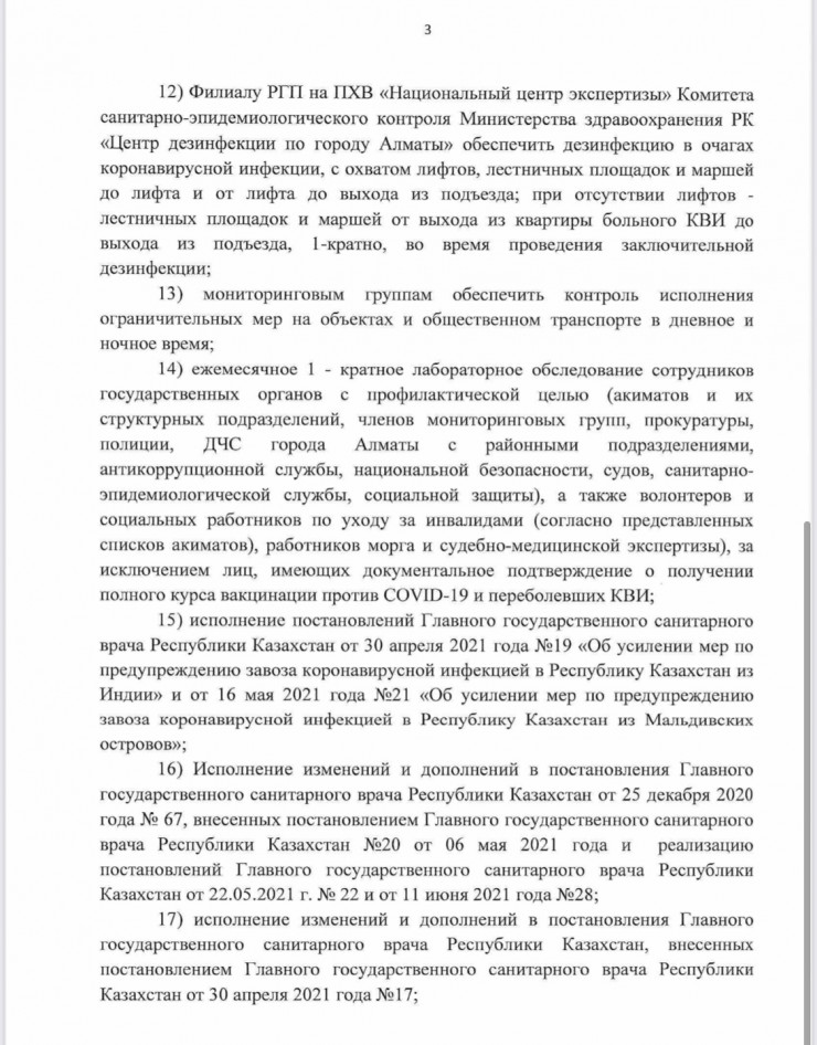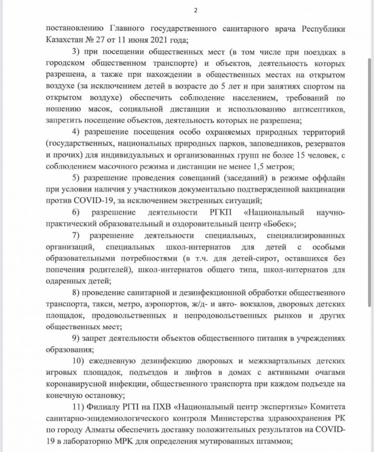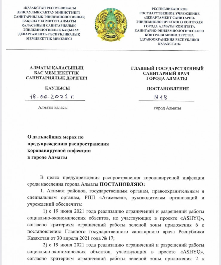 Согласно документу, в Алматы изменились ограничительные меры. Теперь город будет функционировать согласно "зеленой" зоне.