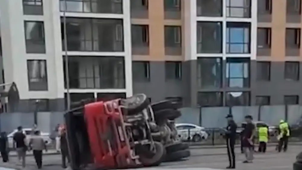 На кадрах, опубликованных в соцсетях, видно, как грузовик с бетоном опрокидывается на бок после столкновения. ДТП произошло по улице Жумабаева.