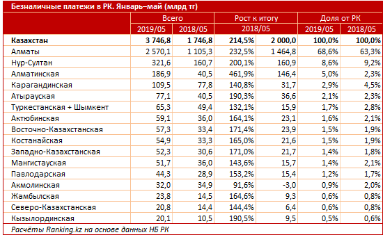 Более 68 процентов всех безналичных платежей приходится на Алматы — 2,6 триллиона тенге. Это в 2,3 раза больше, чем за аналогичный период прошлого года (1,1 триллиона тенге). На втором месте находится Нур-Султан: 321,6 миллиарда тенге, доля составляет 8,6 процента от РК. Замыкает тройку лидеров Алматинская область: 186,9 миллиарда тенге — 5 процентов от общего объема безналичных платежей в стране.