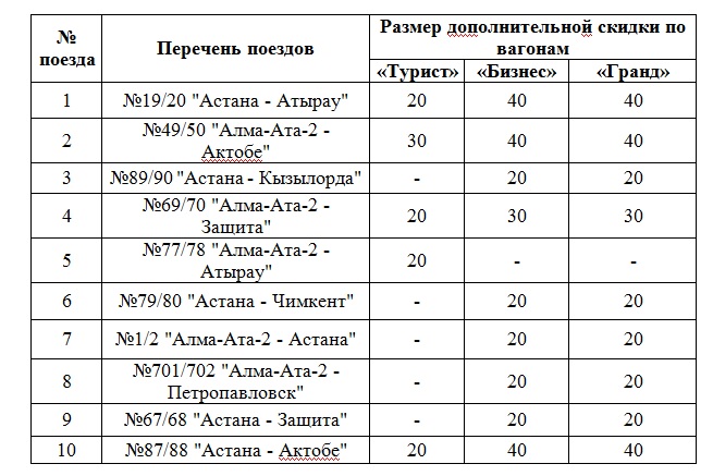 При этом сохраняется действие ранее введенных дисконтных карт на проезд в поездах "Тұлпар-Тальго", которые применяются к следующим категориям: