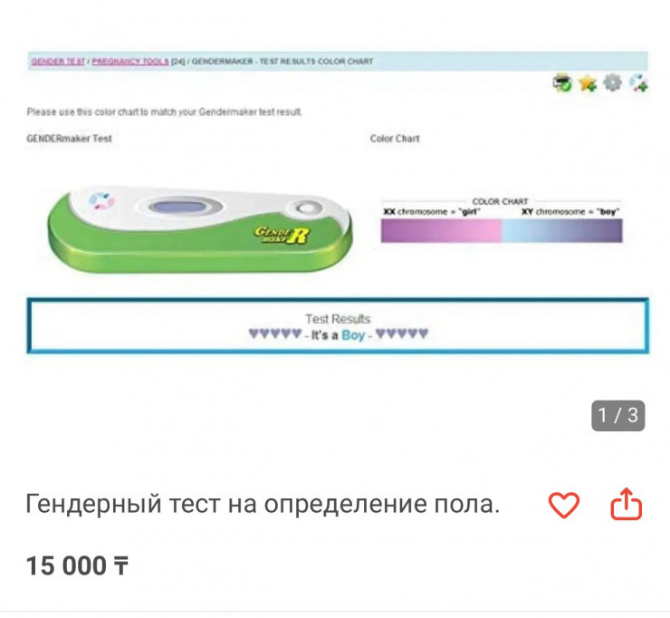 Еще один интересный вариант предлагает казахстанцам приобрести тест для определения пола на ранних сроках беременности. Причем стоит такой тест примерно 15 тысяч тенге.
