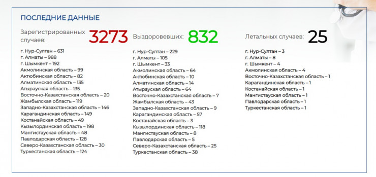Всего в Казахстане подтверждено 3273 случая коронавируса, из них в: