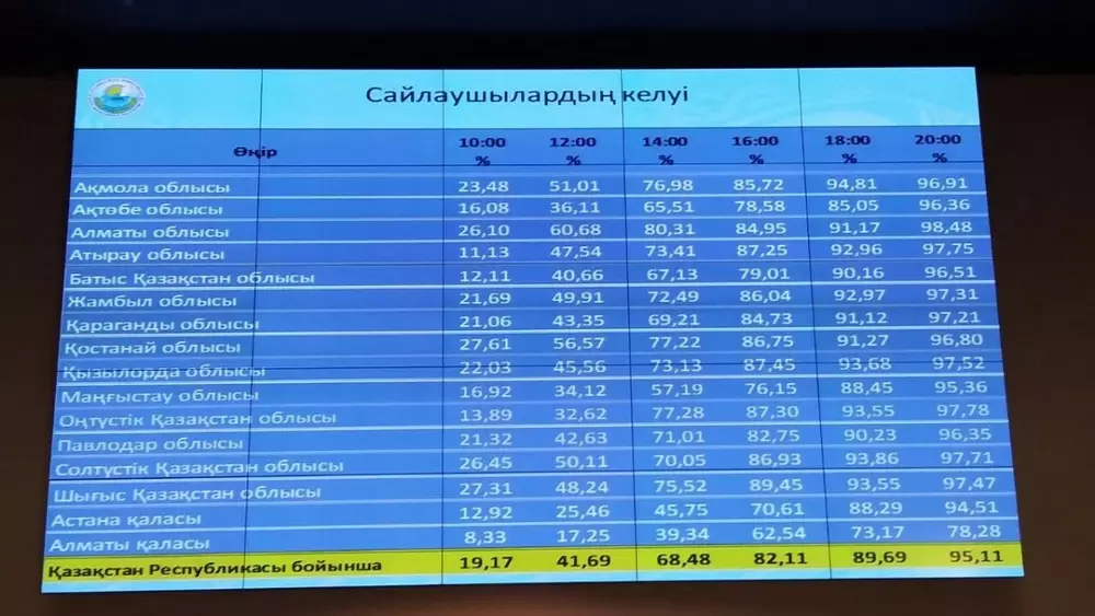 В разрезе регионов ситуация с явкой складывается таким образом: Акмолинская область - 96,91 процента, Актюбинская - 96,36, Алматинская - 98,48, Атырауская - 97,75, Восточно-Казахстанская - 97,47, Жамбылская - 97,31, Западно-Казахстанская - 96,51, Карагандинская - 97,21, Кызылординская - 97,52, Костанайская - 96,8, Мангистауская - 95,36, Павлодарская - 96,35, Северо-Казахстанская - 97,71, Южно-Казахстанская - 97,78, Астана - 94,51, Алматы - 78,28.
