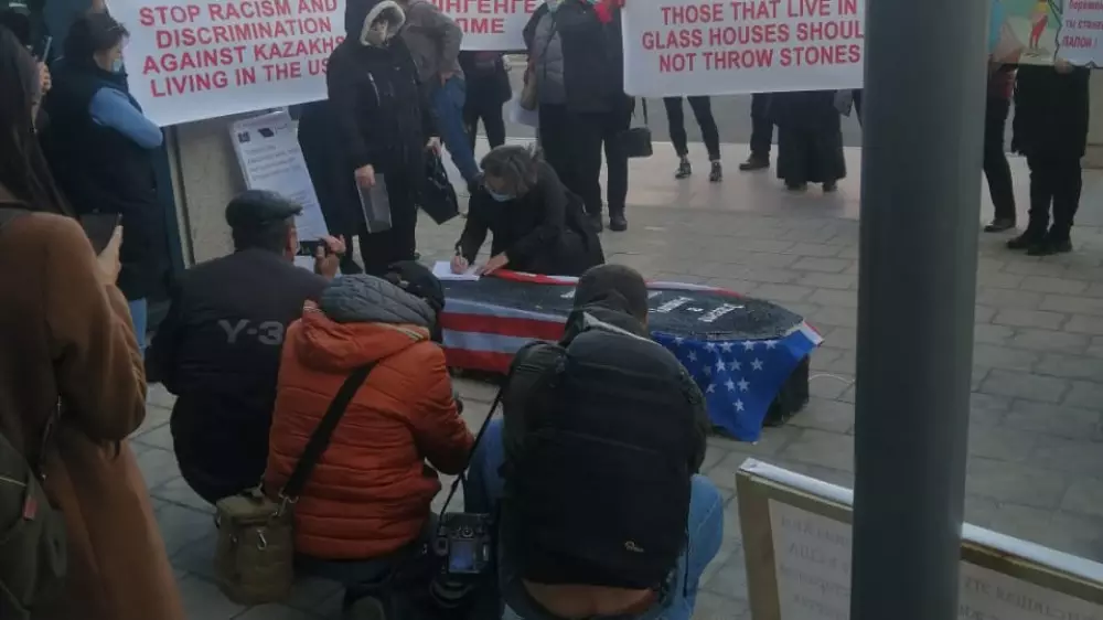 У здания генконсульства собралось около 20 активистов. На плакатах, которые они принесли, написано: "Чья бы корова мычала", "Пусть прекратят оскорблять казахов, которые живут в Америке" и так далее.