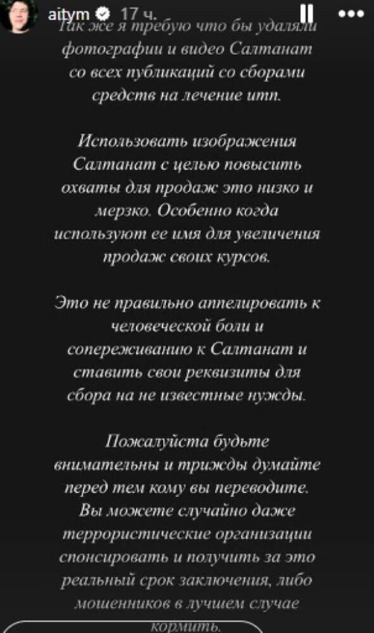 "Я требую, чтобы удаляли фотографии и видео Салтанат со всех публикаций со сборами средств на лечение и тому подобное. Использовать изображения Салтанат с целью повысить охваты для продаж — это низко и мерзко. Особенно, когда используют ее имя для увеличения продаж своих курсов", ‒ написал в Instagram Айтбек Амангельды.