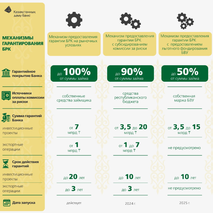 Механизмы утверждены правилами частичного гарантирования по кредитам субъектов частного предпринимательства, разработанными БРК совместно с МНЭ РК и утвержденными постановлением правительства РК от 2 июля 2024 года во исполнение Послания Президента Касым-Жомарта Токаева народу Казахстана от 1 сентября 2023 года.