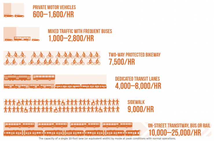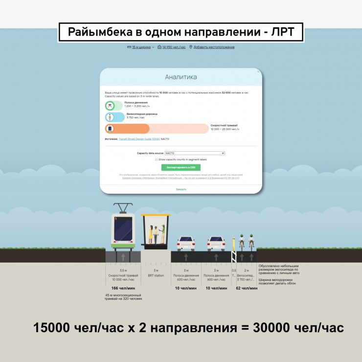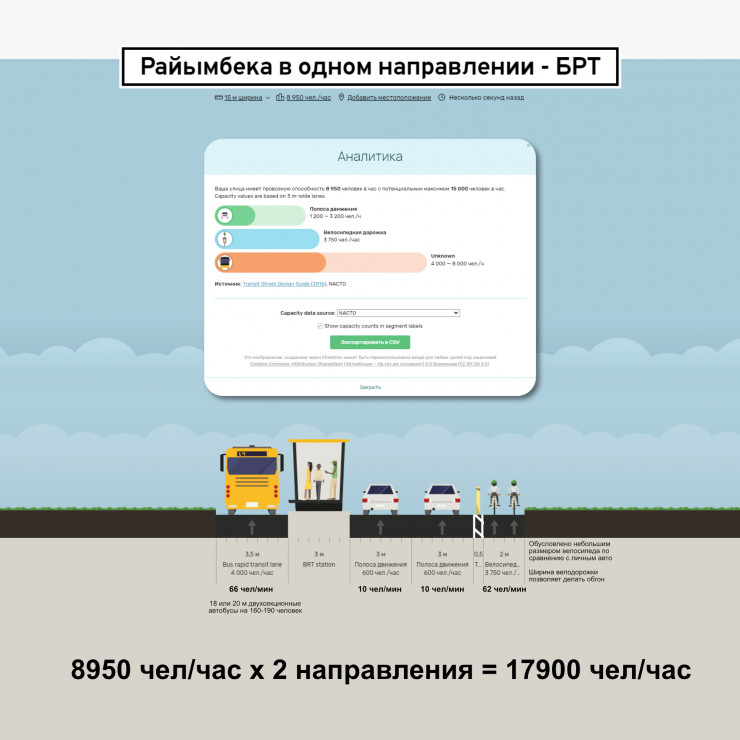 Урбанист провел сравнение эффективности BRT и текущих шести (восемь полос по Райымбека только на отдельных участках, а затем нужно делать поправку на перестроение из восьми полос в шесть полос. Трафик сужается и поэтому куда правильнее делать более пессимистичную оценку) автомобильных полос. Для этого он использовал модель NACTO - это приземленная модель для подсчетов реальной провозной способности улиц. NACTO берет в расчет, что люди не идеальны и дает более пессимистичную оценку провозной способности. Согласно этой модели наиболее неэффективным способом передвижения остается личный автомобиль - от 600 до 1600 человек в час на полосу.