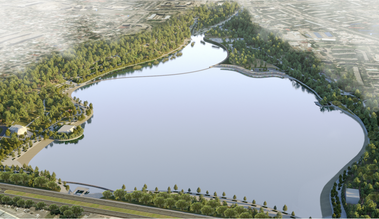 Для создания вокруг водохранилища единого паркового пространства, для защиты парковой территории от шума и загазованности загруженной магистрали города со стороны проспекта Толе би будет создан лесомассив. Вид на озеро останется открытым на западном и восточном входах и на башенном водосбросе с его существующей конструкцией обзорного балкона.