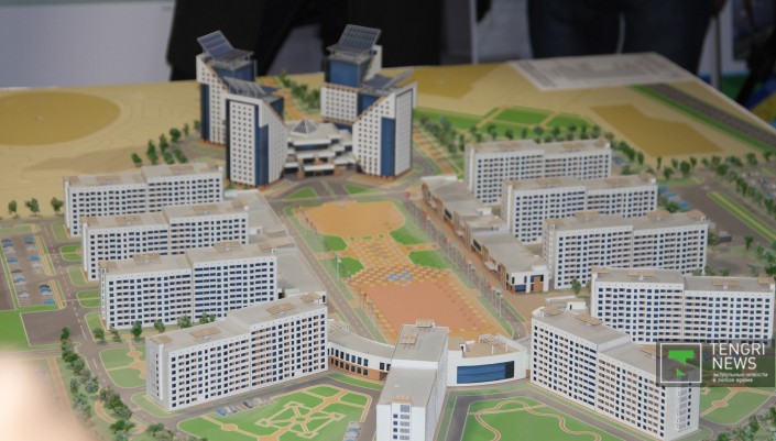 Макет Атлетической деревни. Четыре блока с высотными домами будут олицетворять четыре стороны света. Построены они будут в виде буквы "U" (Universiade - Прим.). Одновременно это и пиктограмма солнечного человека.